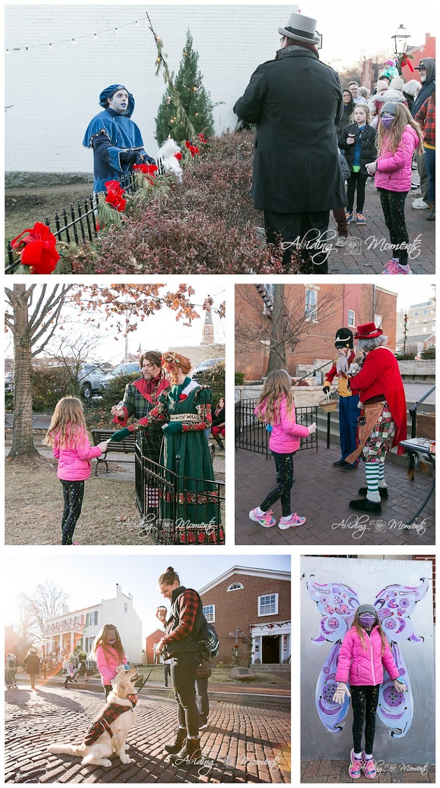 Some of the characters we saw are, well, characters! Jack Frost has a very pun-filled and sarcastic banter about him and is always a favorite! We saw several characters from Charles Dickens', A Christmas Carol, including the Fezziwigs, who were Mr. Scrooge's boss from his Christmas past. We watched the inventor and toy maker, Herr Drosselmeyer, interact with his creation, the Nutcracker Prince, who inspired the 1816 tale The Nutcracker and Mouse King. We also saw many four-legged friends, definitely a popular guest families bring along, as well as getting to take pictures with the Sugar Plum fairy wings painted by a local high school student for young visitors to enjoy!